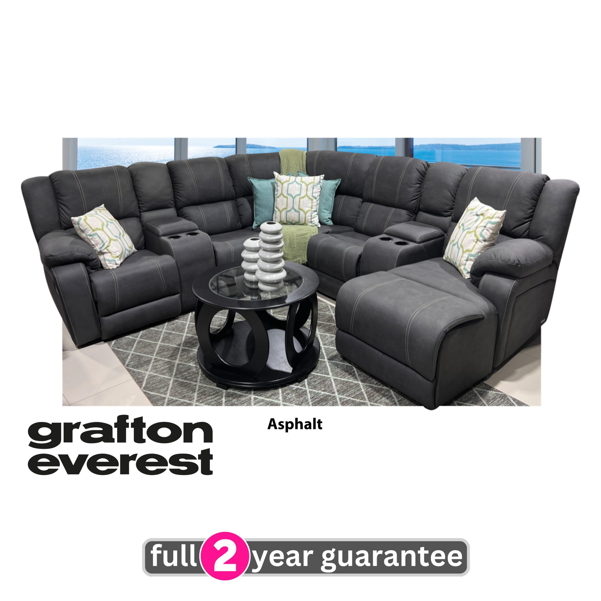 Exclusive to Furniturevibe. The Ariel 5pce corner lounge suite by Grafton Everest, features a daybed for complete relaxation, 2 x cinema consoles with cup holders for convenience and one recliner for maximum comfort. Upholstered in an embossed microfibre fabric.