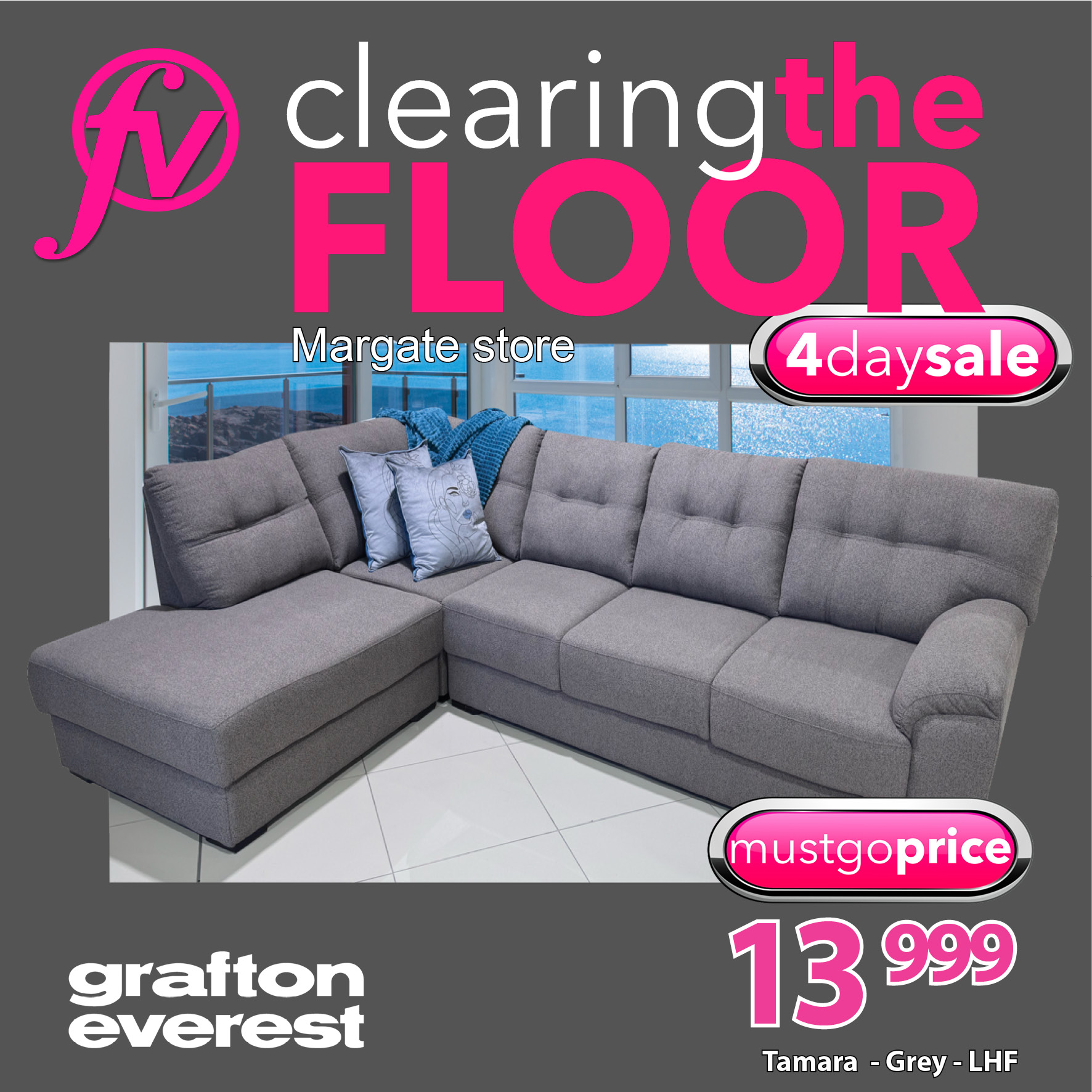 Exclusive to Furniturevibe. The TAMARA by Grafton Everest is a large 2pce corner couch and is covered in a durable fabric. Ultra comfortable. Pictured as a left hand facing suite LHF.