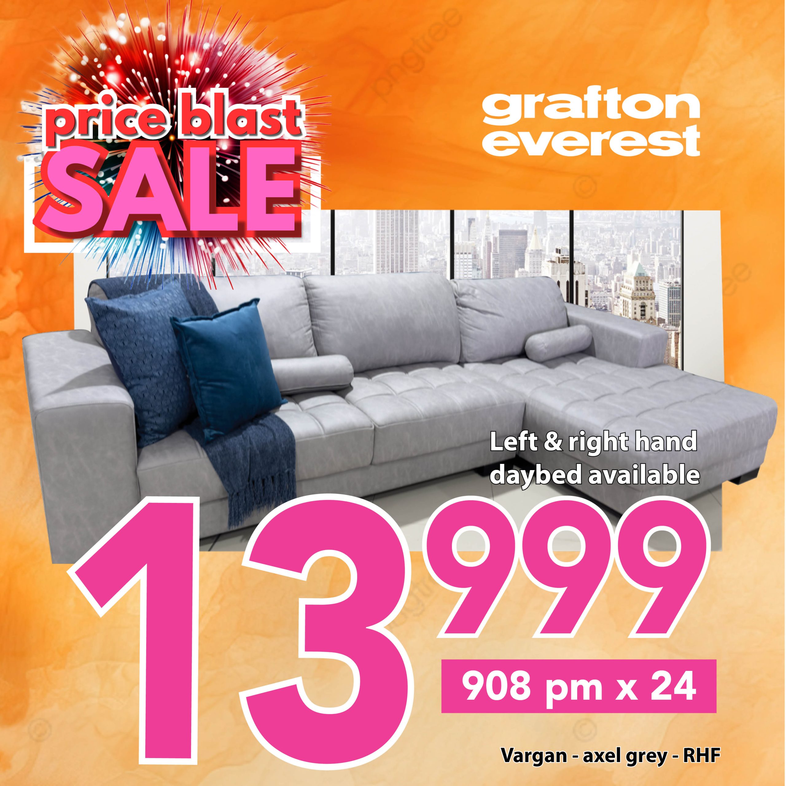 Exclusive to Furniturevibe, the VARGAN manufactured by Grafton Everest, is a large 2pce couch with chaise and is covered in a durable fabric. Pictured as a left hand facing RHF, also available as a left hand facing LHF.